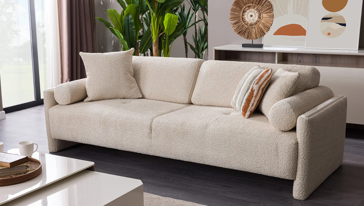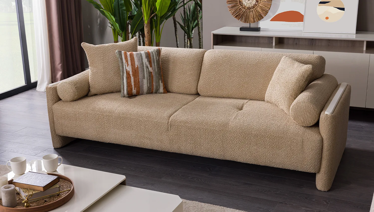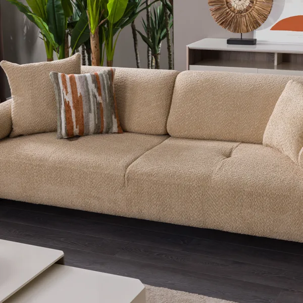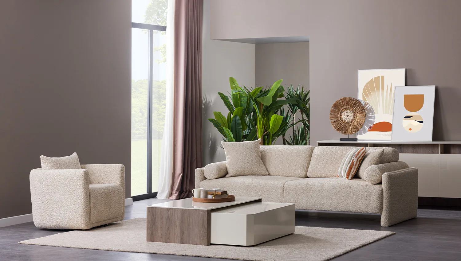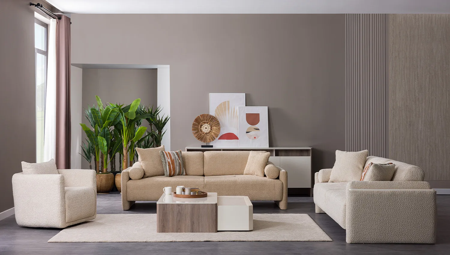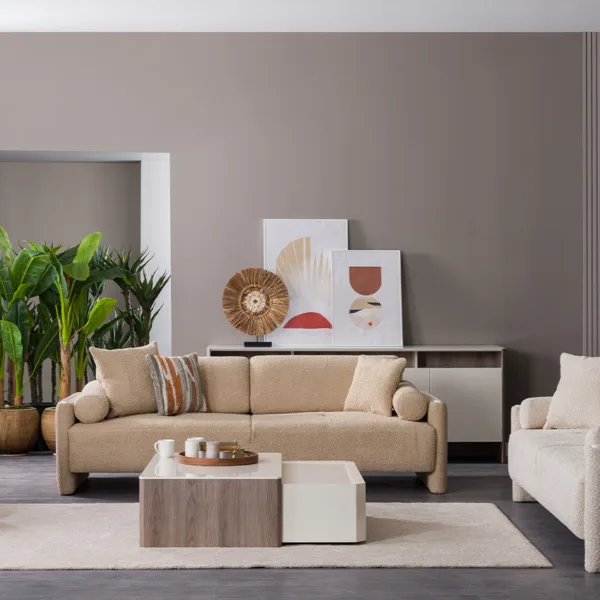تم تصميم طقم الأنتريه بأسلوب مودرن أنيق يتماشى مع أحدث صيحات ديكور غرف المعيشة. الألوان المختارة بعناية—البيج الفاتح والبيج الغامق—تضفي إحساسًا بالدفء والراحة مع لمسة من الفخامة الراقية، لتناسب مختلف الأذواق وأنماط الديكور الداخلي.