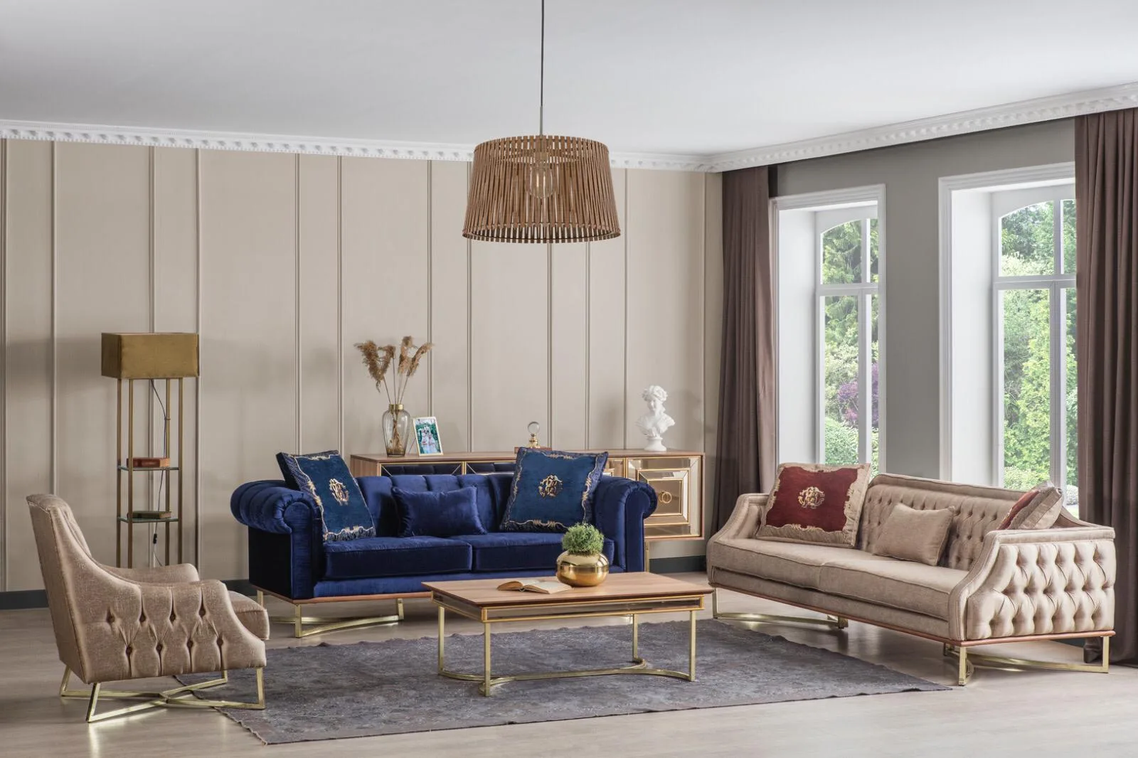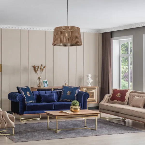 يجمع هذا الطقم الفاخر بين تصميم النيو كلاسيك الراقي وخطوط التصميم الحديثة، حيث تتكامل الألوان الفخمة مثل الكحلي الغامق والبيج الفاتح لخلق تناغم بصري هادئ وأنيق.