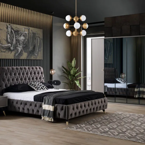 • سرير كابتونيه 160×200 سم مغطى بقماش فاخر رمادي، يضفي لمسة راقية ويجمع بين الراحة والفخامة.