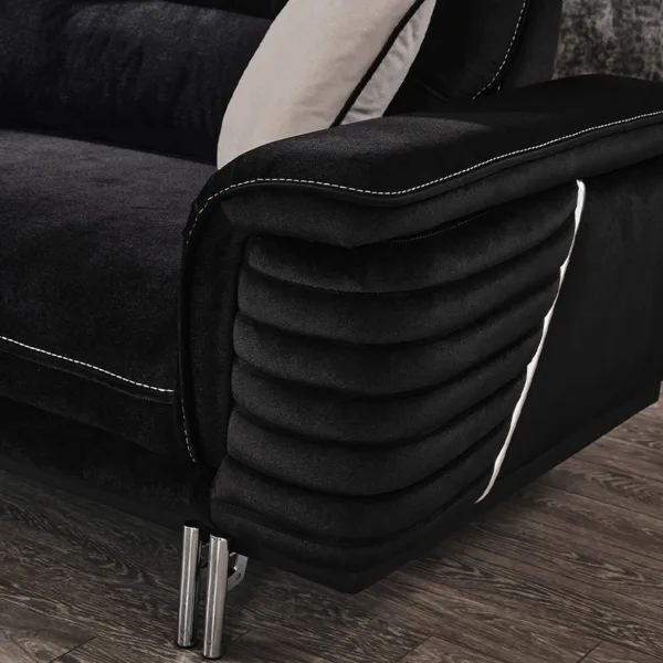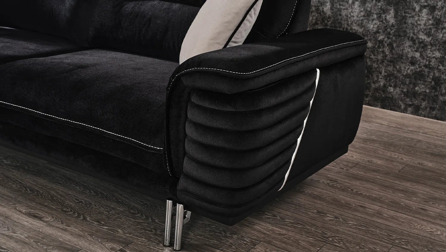 تم تصنيع الهيكل من خشب الزان الطبيعي، المعروف بقوته ومتانته ضد عوامل الزمن، لضمان عمر طويل وثبات فائق. تغليف الطقم بقماش قطيفة فاخر بلونين متناسقين: الأسود والبيج الفاتح، يمنح إحساسًا بالدفء والرقي، ويضفي تباينًا بصريًا مميزًا يناسب معظم ألوان الديكور.