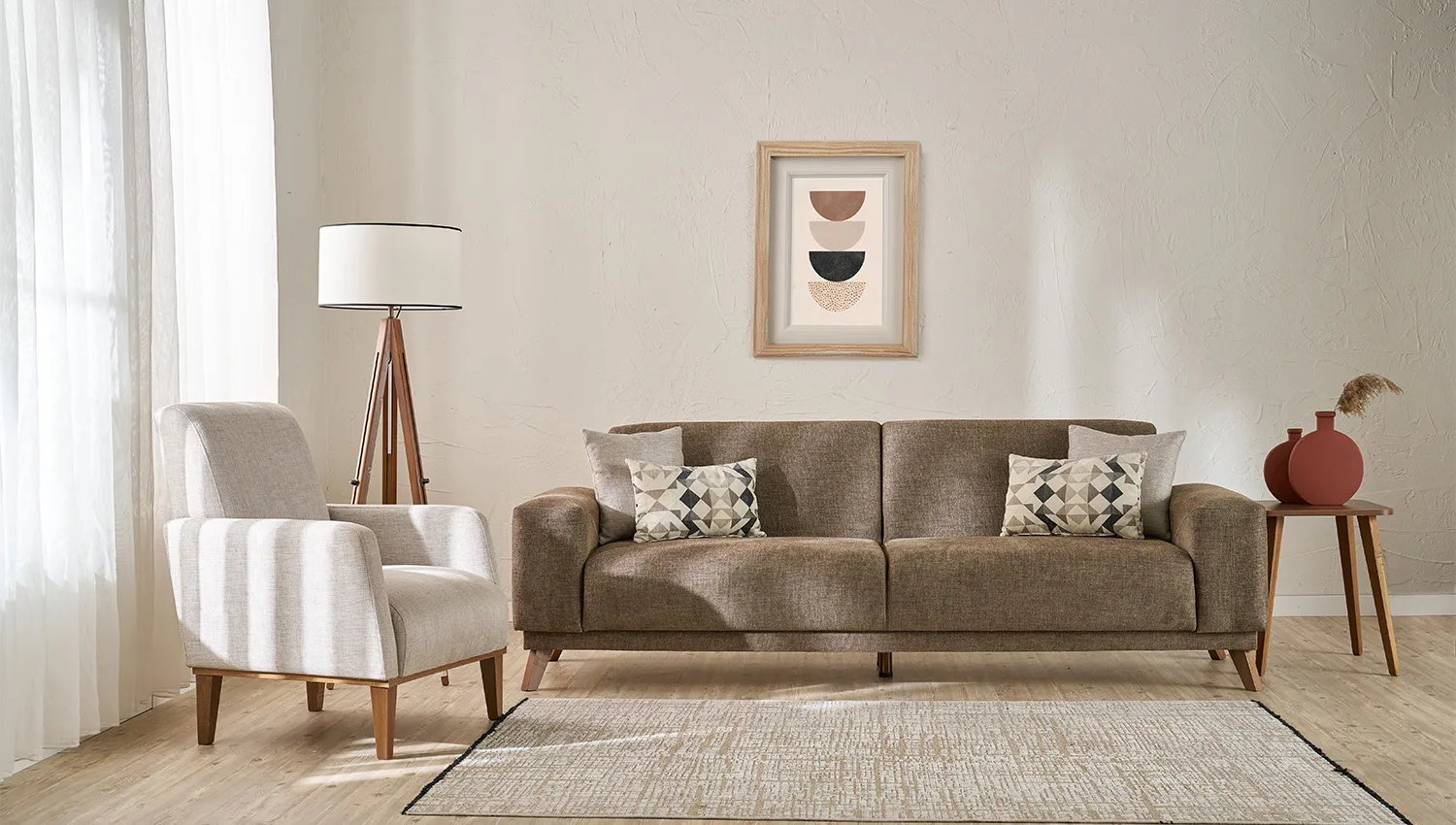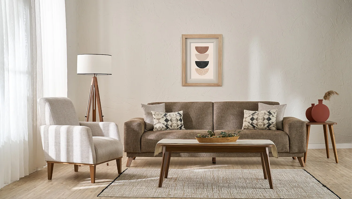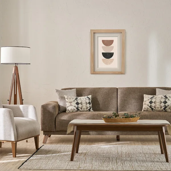 تناسق الألوان بين البيج الفاتح والبني الغامق يضيف لمسة دافئة وعصرية لغرفة المعيشة.