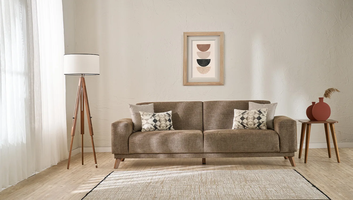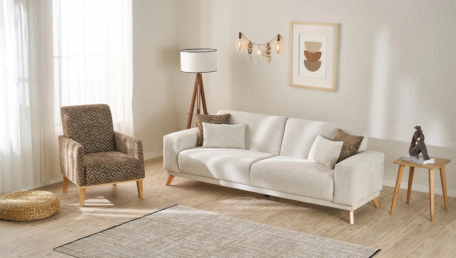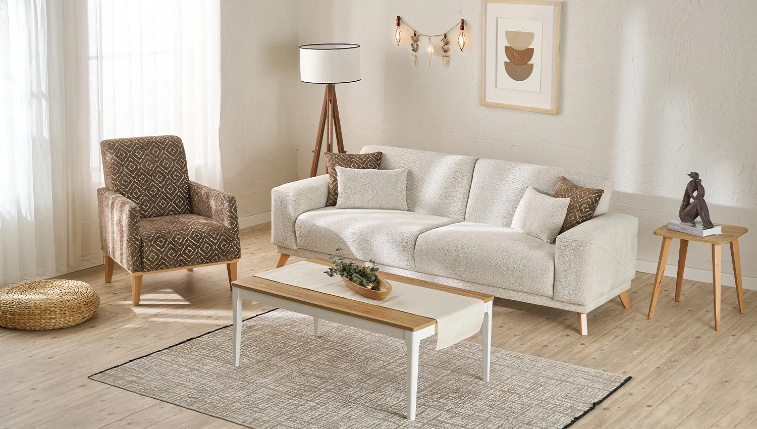 تناسق الألوان بين البيج الفاتح والبني الغامق يضيف لمسة دافئة وعصرية لغرفة المعيشة.