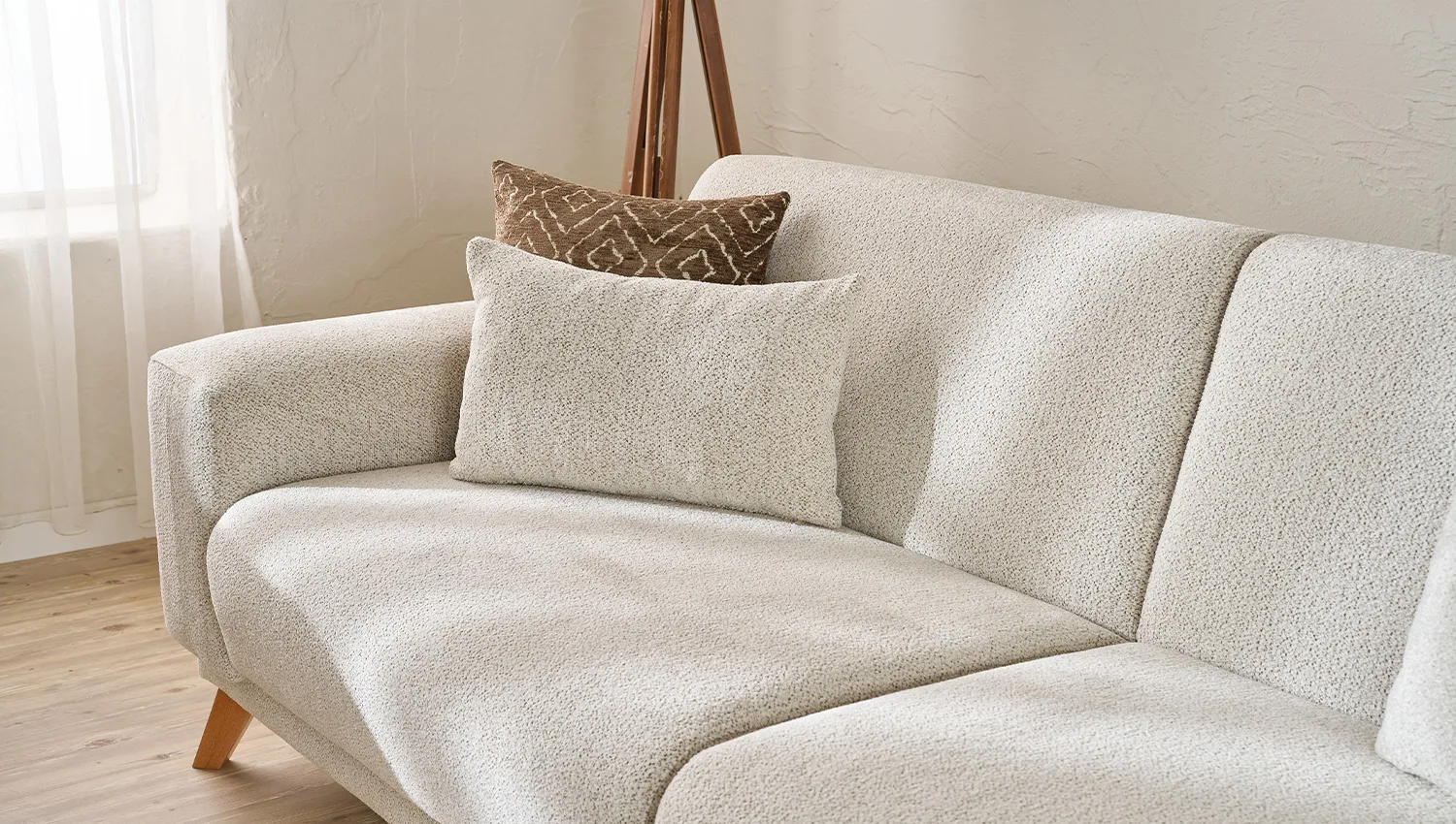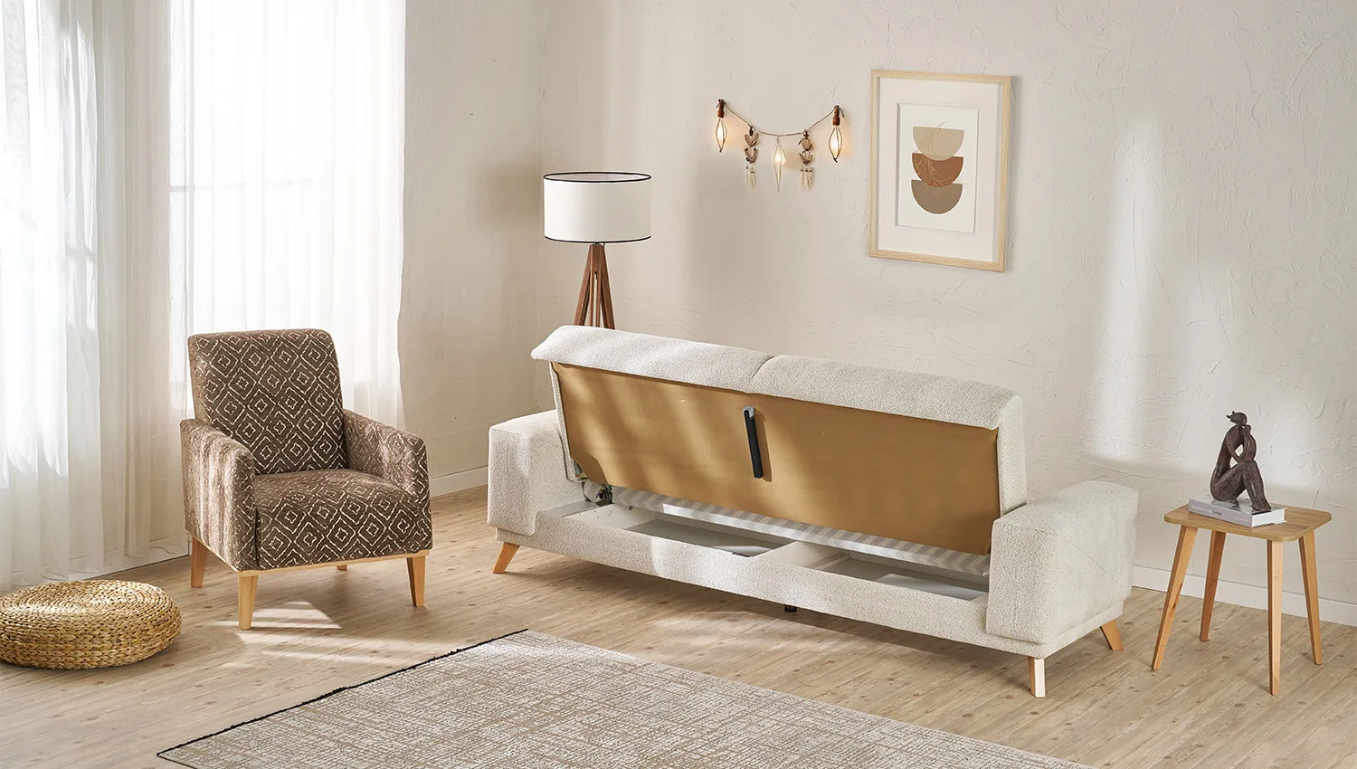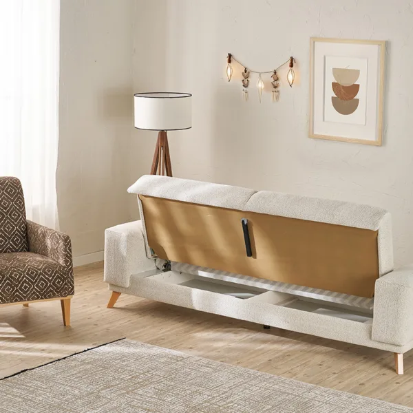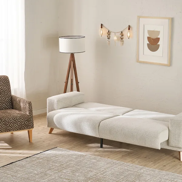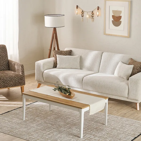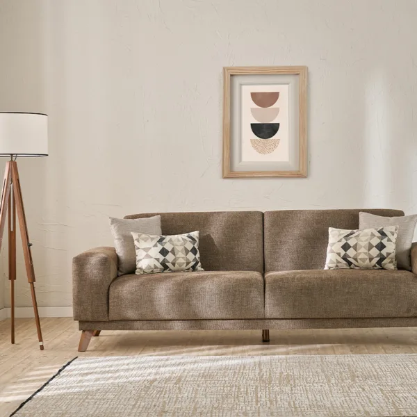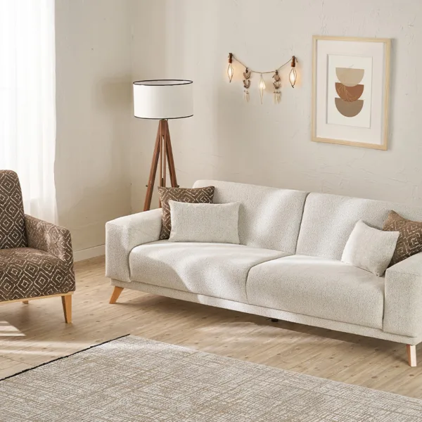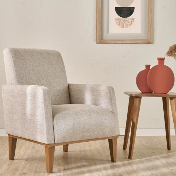 الهيكل مصنوع من خشب الزان الطبيعي المعروف بقوته ومتانته، مما يضمن عمرًا افتراضيًا طويلاً وثباتًا عالياً. أما القماش، فقد تم اختياره بعناية ليوفر نعومة الملمس ومقاومة الاستخدام اليومي، ليجمع بين العملية واللمسة الجمالية.