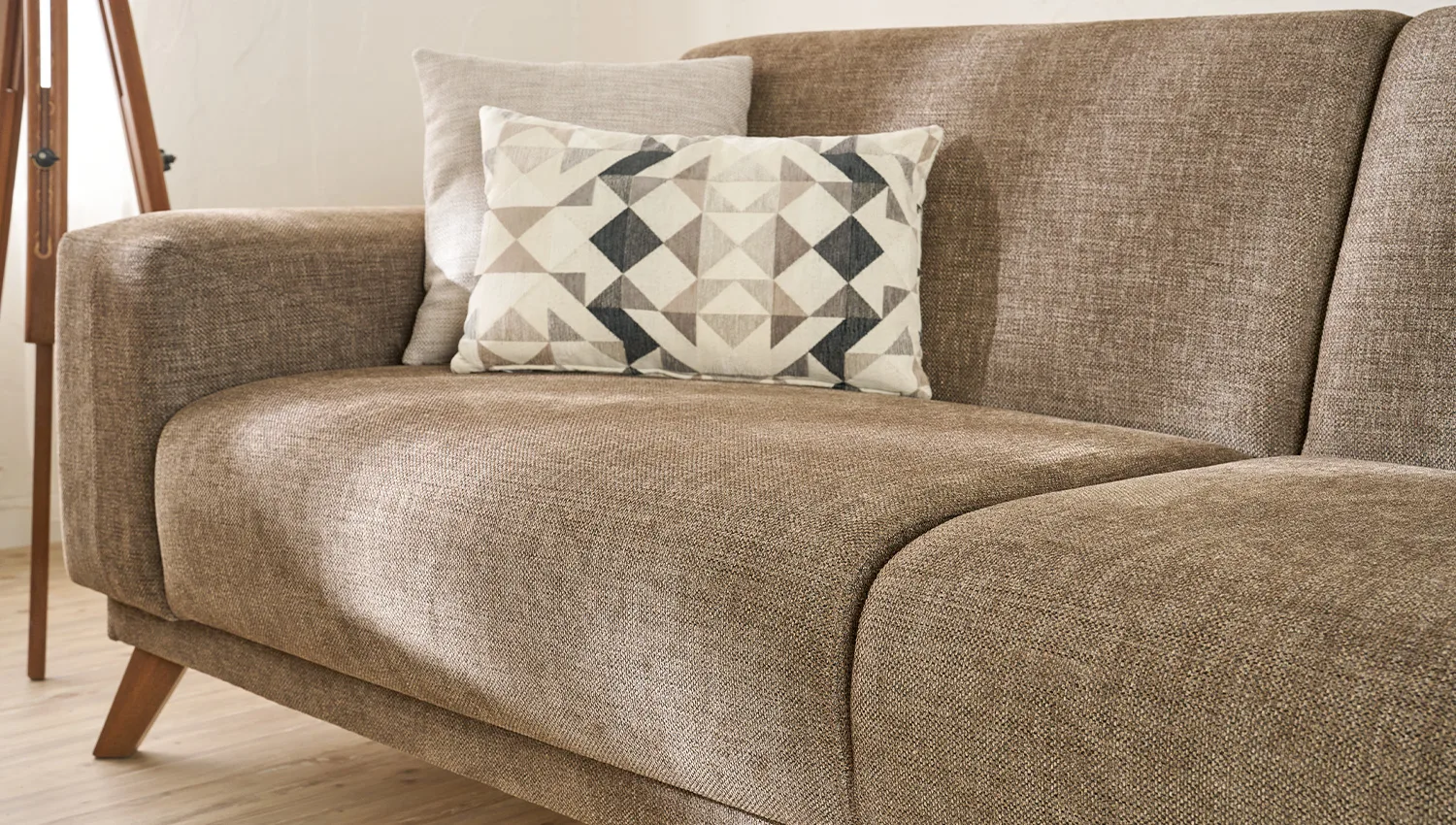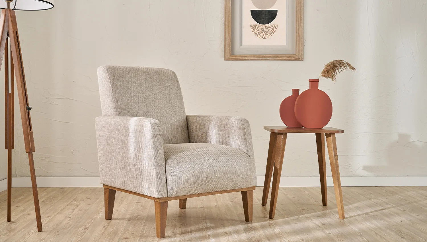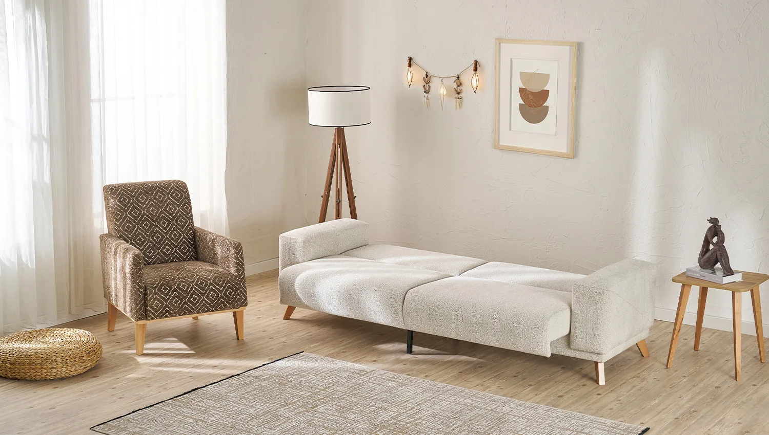 الهيكل مصنوع من خشب الزان الطبيعي المعروف بقوته ومتانته، مما يضمن عمرًا افتراضيًا طويلاً وثباتًا عالياً. أما القماش، فقد تم اختياره بعناية ليوفر نعومة الملمس ومقاومة الاستخدام اليومي، ليجمع بين العملية واللمسة الجمالية.