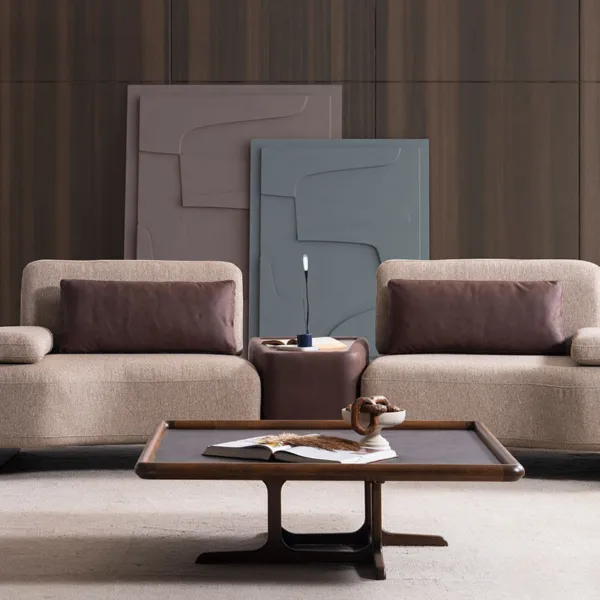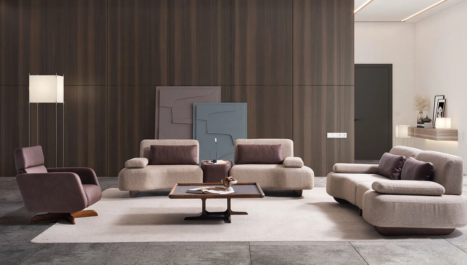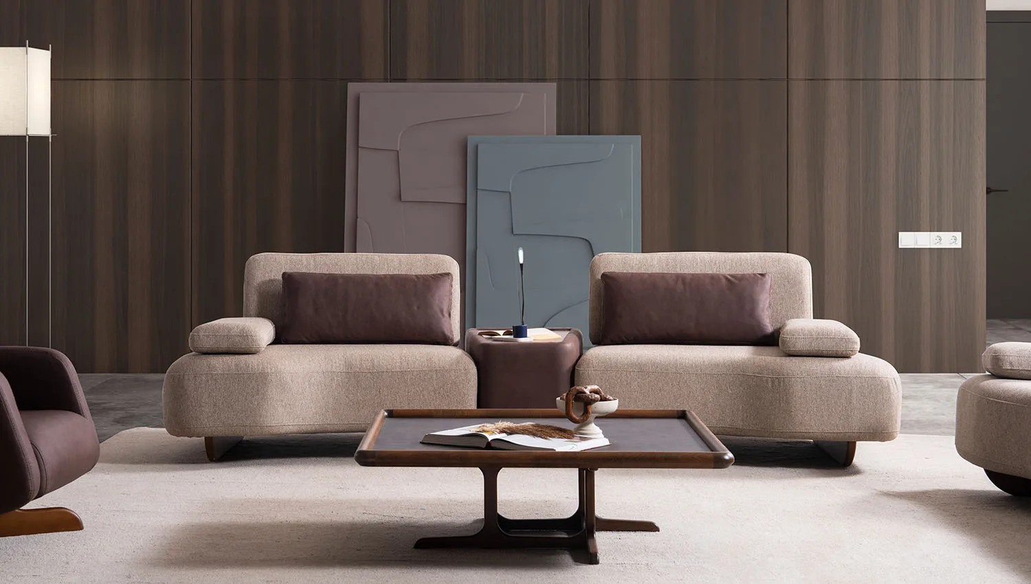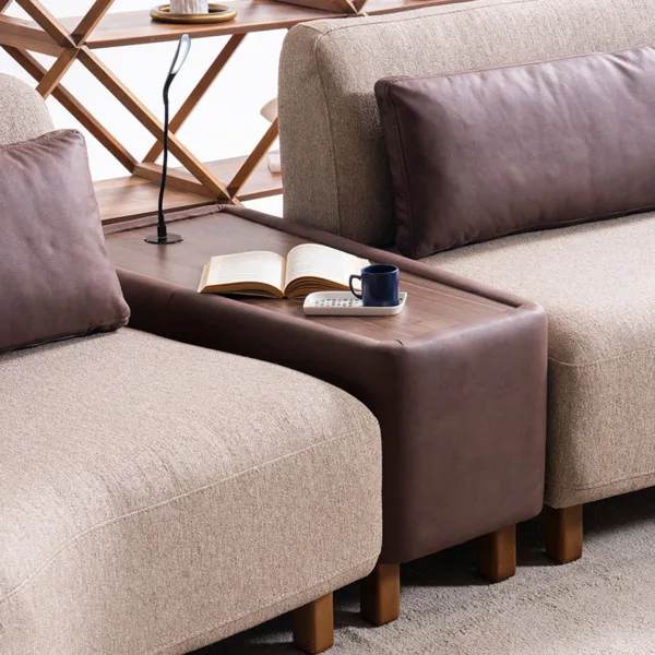 تم تصميم طقم أنتريه تروفا ليكون رمزاً للأناقة العملية في عالم الأثاث المودرن. يجمع بين اللون البني الغامق والبيچ الفاتح في تناسق مثالي يضفي دفئاً وجاذبية على ديكور غرفة المعيشة.