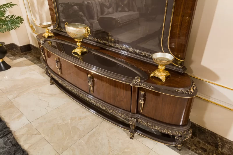 وحدة تلفاز فاخرة مصممة بتناسق مع الطقم، لتجمع بين الأناقة والوظيفة العملية.