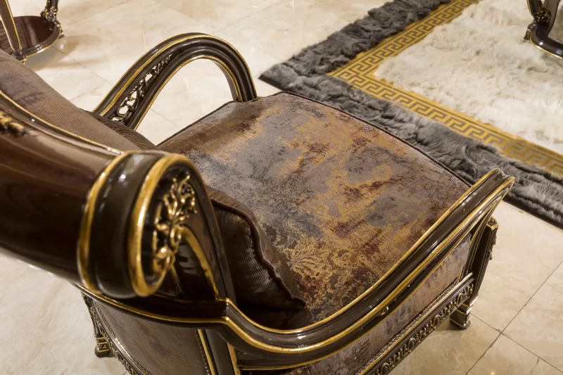 تم تصميم طقم أنتريه إيليجانس بعناية ليكون تحفة فنية تضيف رونقاً خاصاً إلى غرفة المعيشة. يعتمد في هيكله على خشب الزان الطبيعي المعروف بمتانته وصلابته، مما يضمن عمرًا طويلاً ومتانة استثنائية. أما الكسوة الخارجية فهي من القماش القطيفة البني الفاخر الذي يضفي لمسة دافئة وأنيقة على المكان، مع ملمس ناعم ومريح للجلوس.