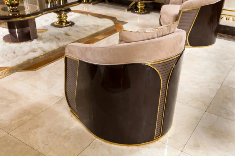 أما القماش المختار بعناية، فهو قماش فاخر عالي الجودة باللون البني، يضفي لمسة دافئة وحميمية على الغرفة، وفي نفس الوقت مقاوم للتآكل ويحافظ على مظهره الأنيق لفترات طويلة.