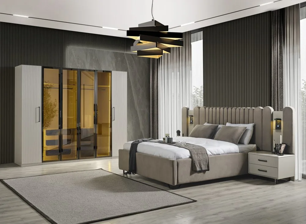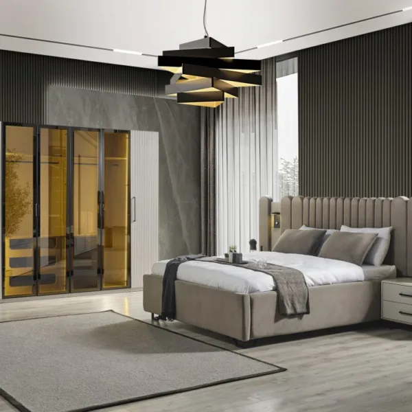 تمتاز غرفة النوم هذه بتصميم مستوحى من الطراز الهولندي العصري الذي يجمع بين البساطة والجاذبية، حيث تأتي بدرجات البيج الراقية التي تعزز من الإحساس بالهدوء والراحة.
