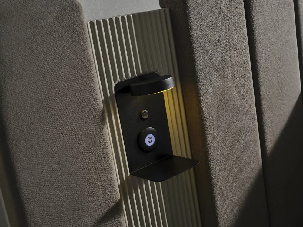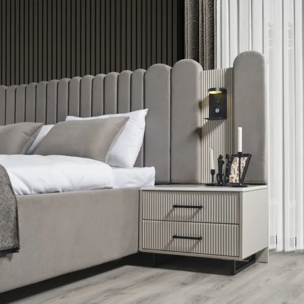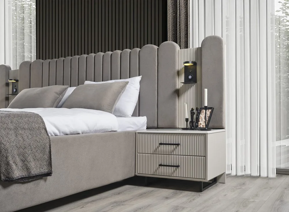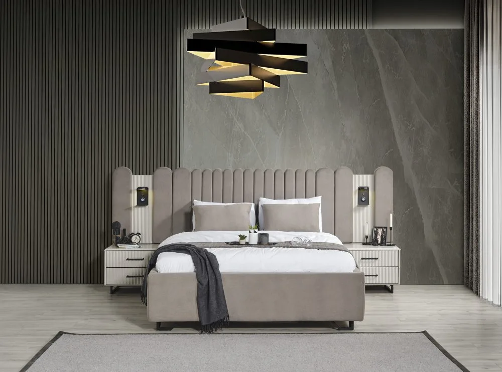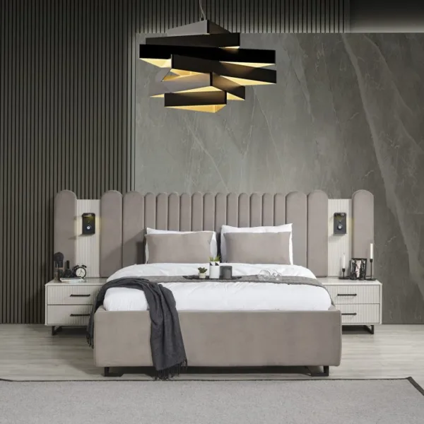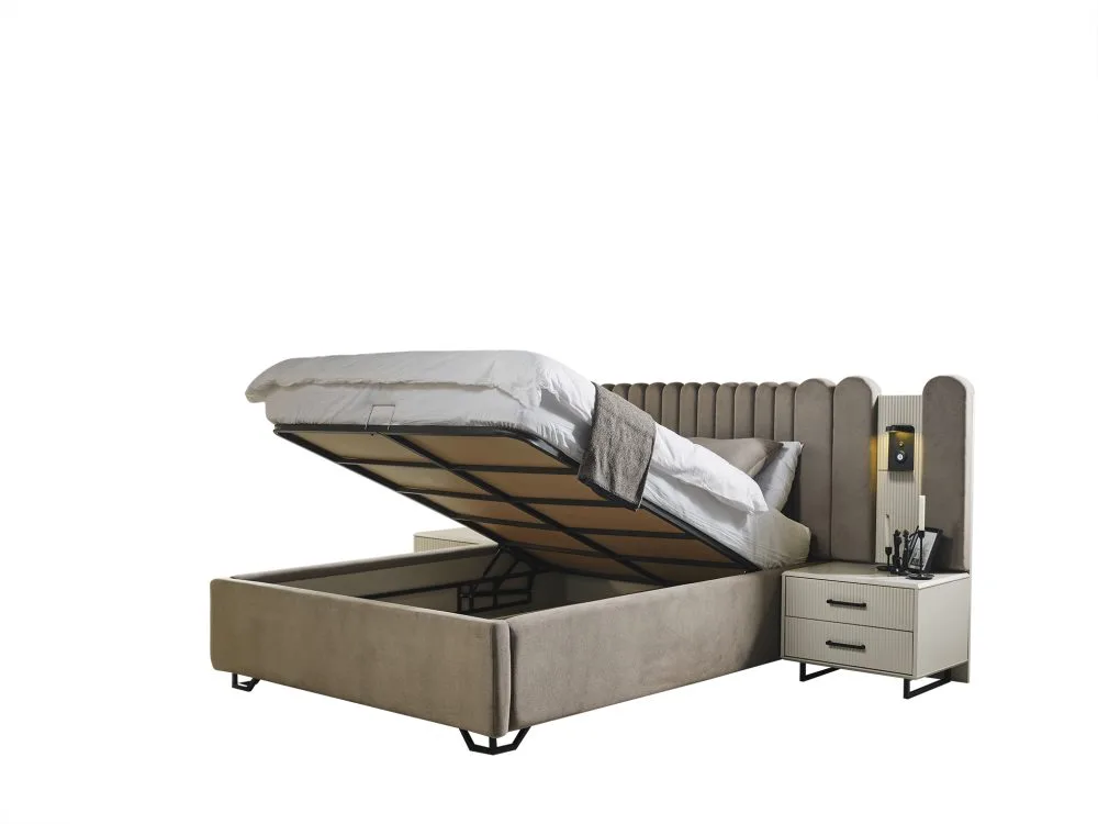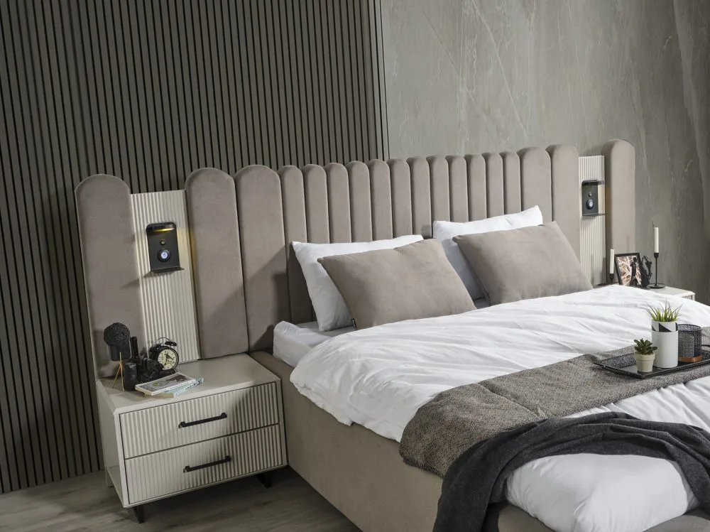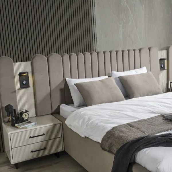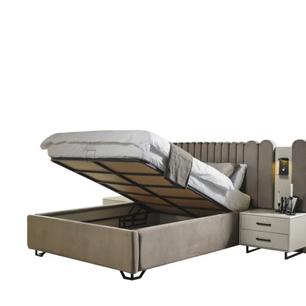 • سرير بقياس 200×160 سم، مزود بظهر مبطن قطيفة أنيق يوفر راحة استثنائية.
