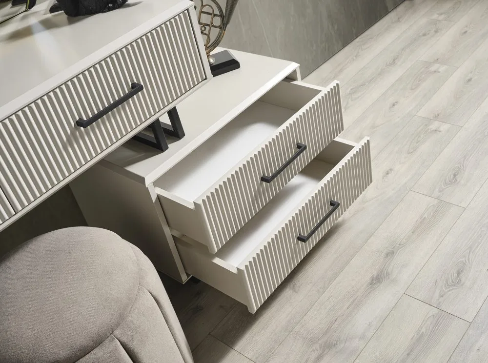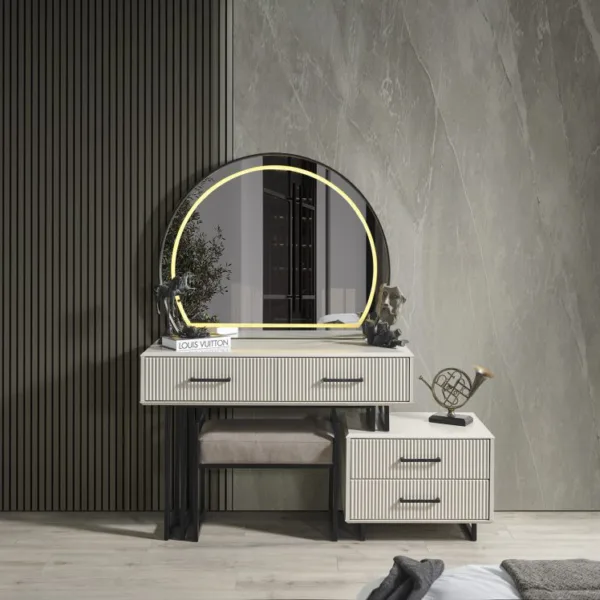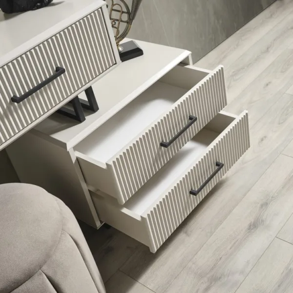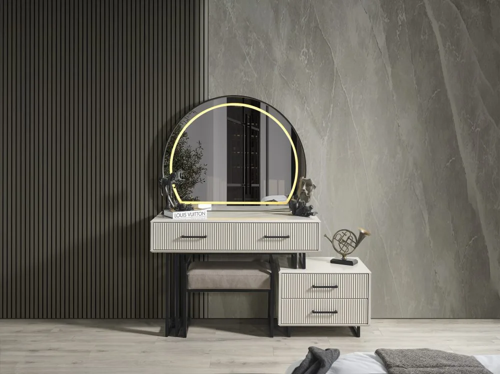 • تسريحة أنيقة بطول 140 سم، مع مرآة أنيقة ومساحات تخزين مثالية لأدوات التجميل.