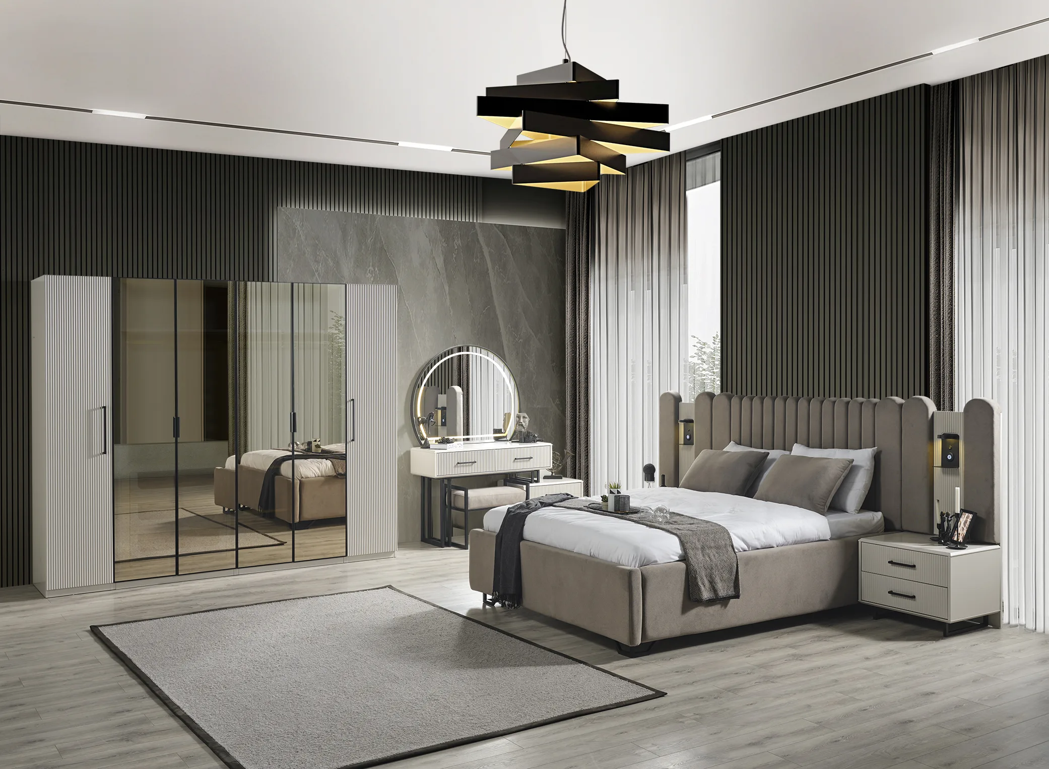 استمتع بالأناقة والراحة مع غرفة نوم بيج فاخرة بتصميم هولندي فريد، مصنوعة بدقة كبس دمياطي وجودة عالية، تشمل سرير مريح، دولاب واسع، تسريحة أنيقة وكومود عملي.