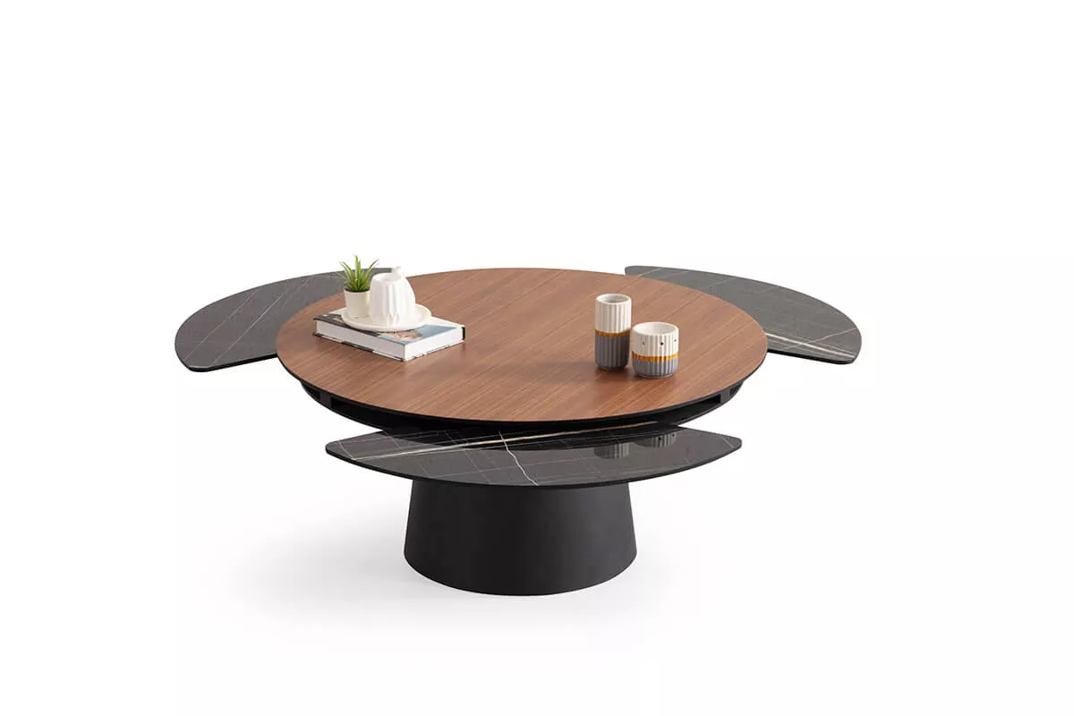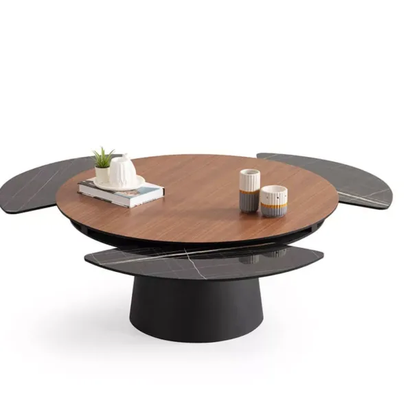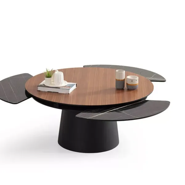 تعتبر طاولة القهوة هذه محوراً أساسياً في غرفة المعيشة أو الصالون، حيث تكمل إطلالة الانتريه أو الكنبات، وتوفر مساحة عملية لوضع المشروبات، الكتب، أو مستلزمات الضيافة. كما تضيف لمسة جمالية تجعلها نقطة تركيز في التصميم الداخلي للغرفة.