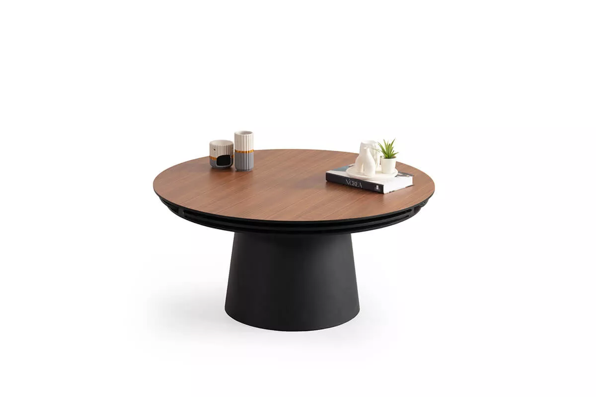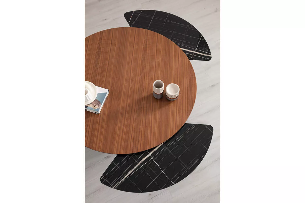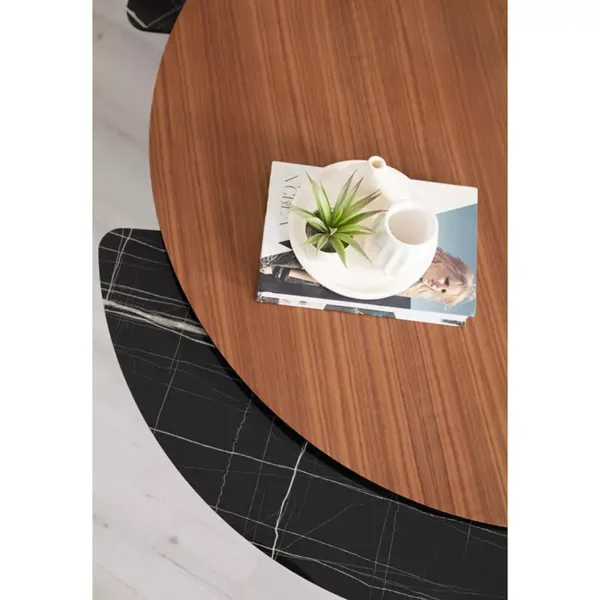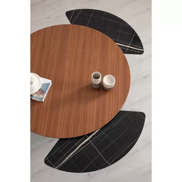 تم تصميم هذه الطاولة بأسلوب مودرن عصري يتناسب مع مختلف أنماط الديكور الحديثة، سواء كانت بسيطة أو فاخرة. تأتي الطاولة مصنوعة من خشب الكونتر عالي الجودة، المعروف بمتانته ومقاومته للاستخدام اليومي، مع لمسة جمالية مستوحاة من خشب الجوز الطبيعي باللون البني الغني، الذي يضفي إحساساً بالدفء والراحة في المكان.
