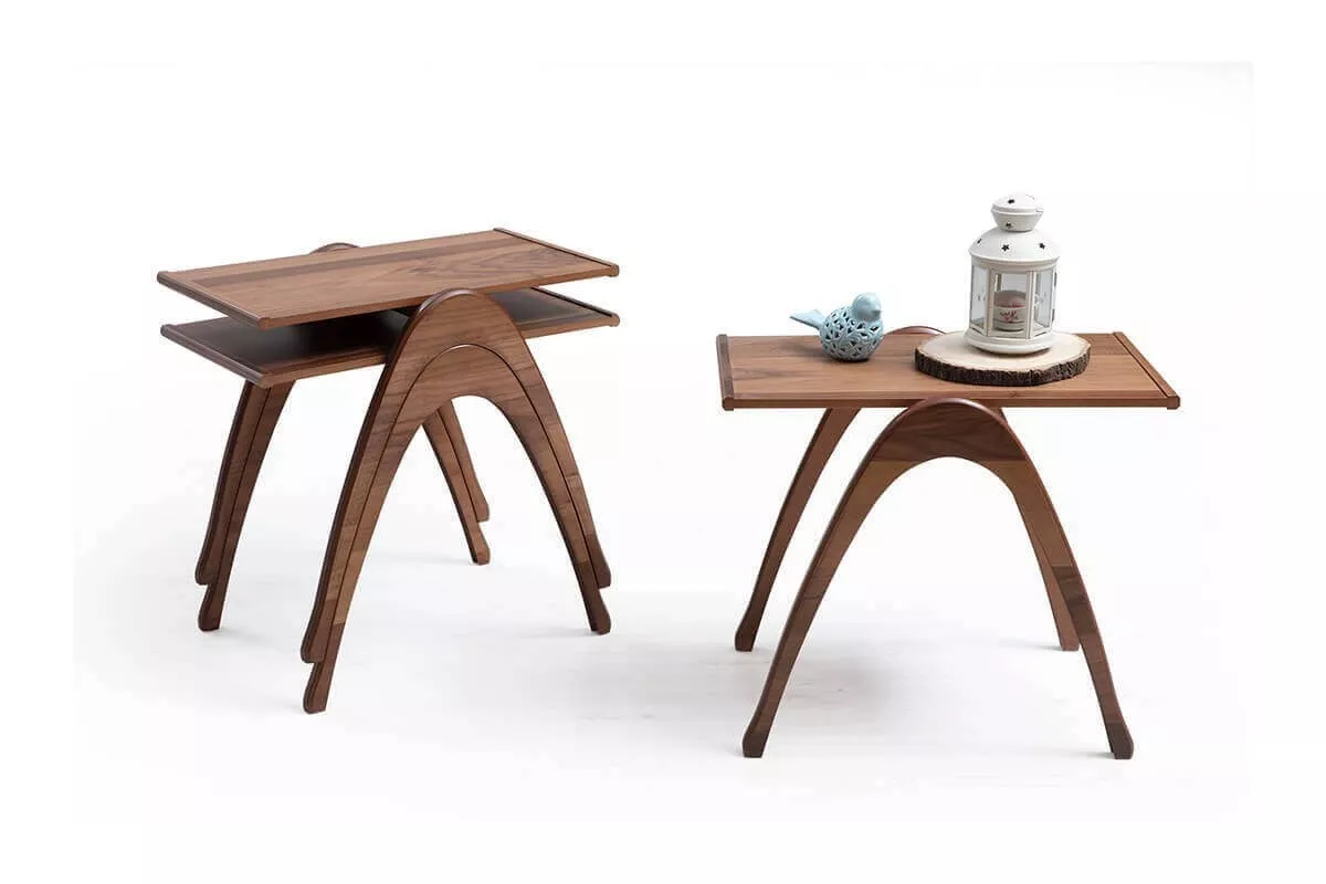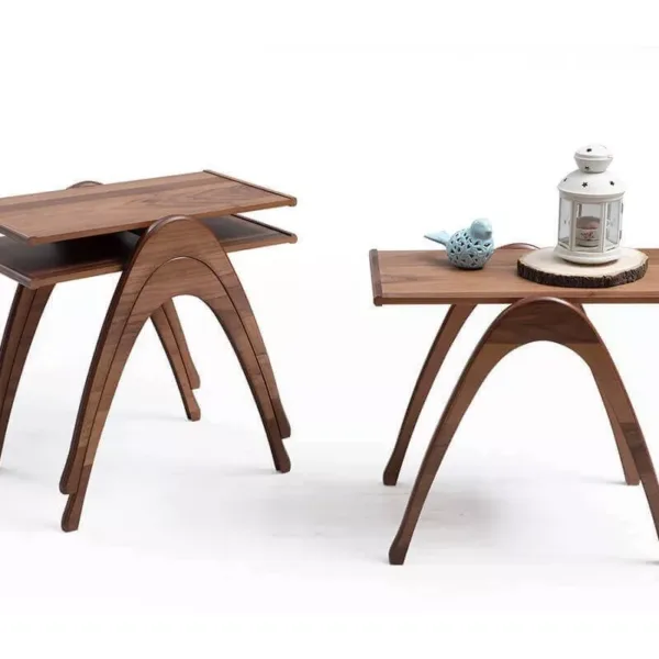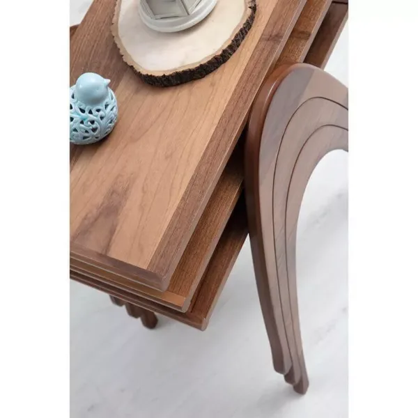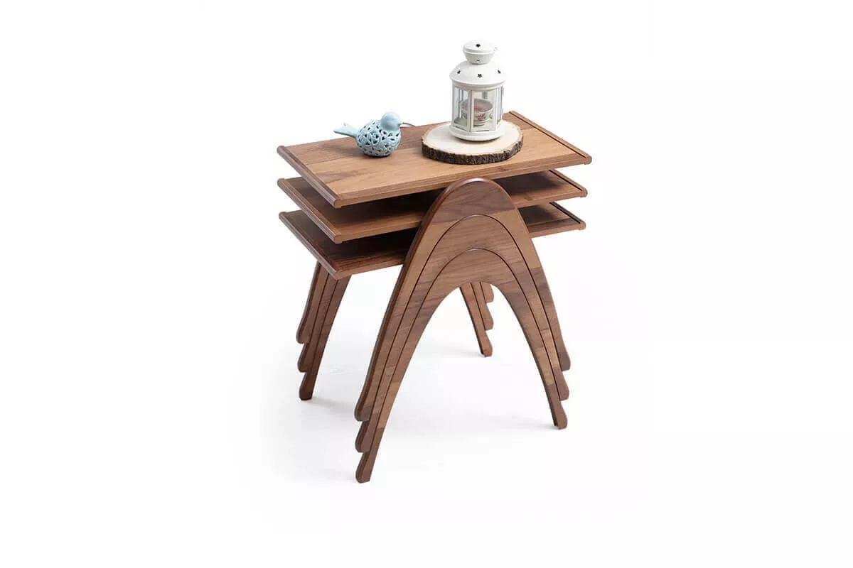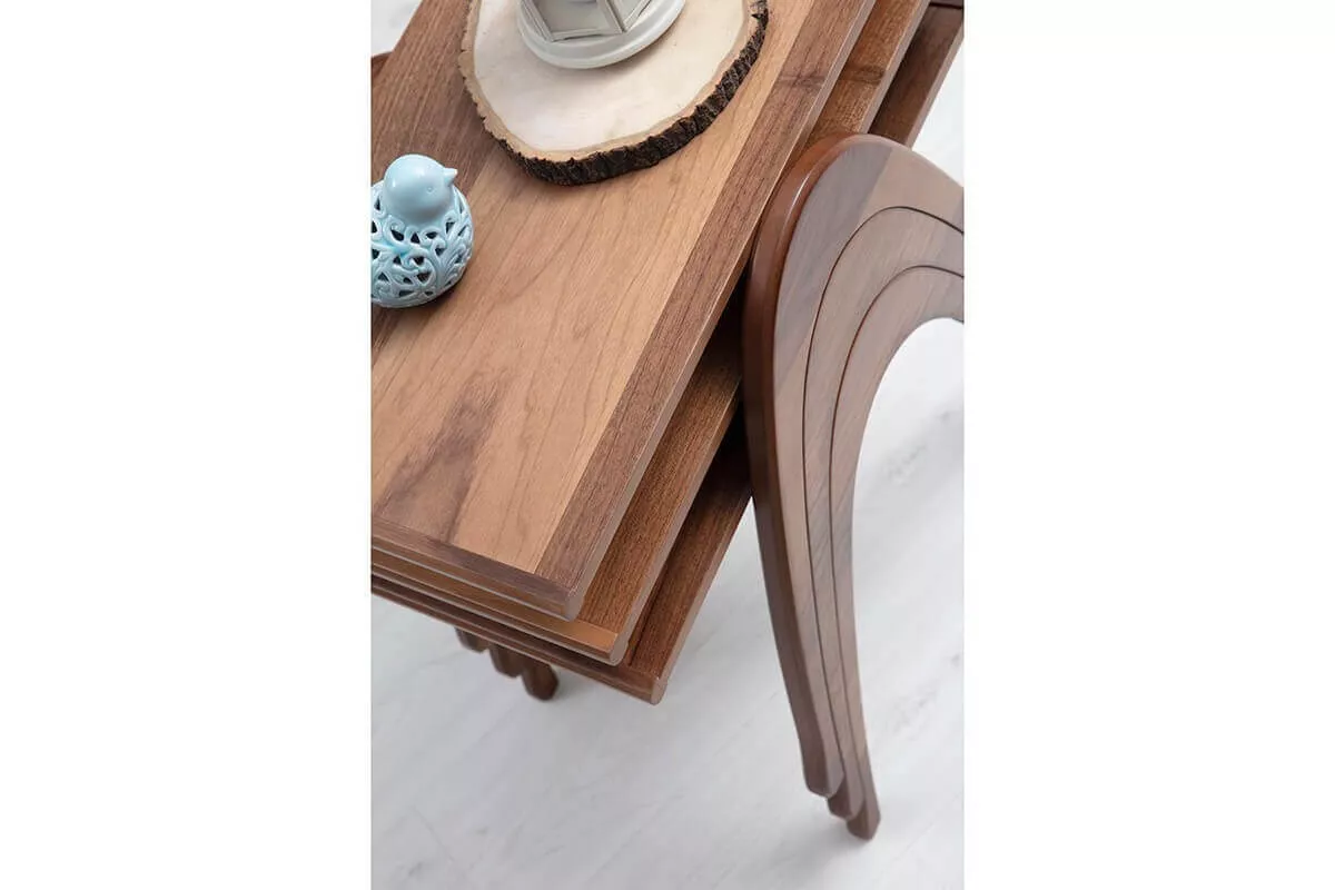 الطقم يتكون من 3 طاولات صغيرة بتصميم زيغون عملي، يمكن استخدامها منفردة كطاولات قهوة جانبية أو تجميعها معاً لتوفير سطح إضافي عند استقبال الضيوف. كما يسهل ترتيبها وتخزينها داخل بعضها لتوفير المساحة في الغرف الصغيرة.